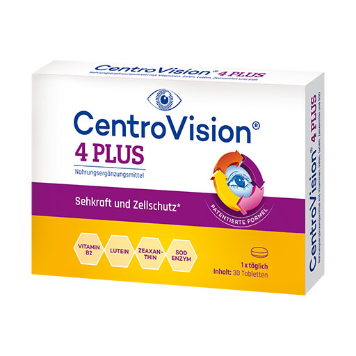Für die Meisten von uns ist es selbstverständlich, dass die Augen gut funktionieren. Dabei sind sie täglich vielen äußeren Einflüssen wie z. B. Blaulicht am Bildschirm, UVStrahlung oder Luftverschmutzung ausgesetzt, die zur Entstehung von freien Radikalen und oxidativem Stress führen, was wiederum die Zellen schädigen kann. Um den Belastungen standzuhalten, ist das Auge auf eine ausreichende Versorgung mit bestimmten Mikronährstoffen angewiesen. CentroVision® 4 P LUS i st e in m odernes N ahrungsergänzungsmittel, dessen Zusammensetzung unter ernährungswissenschaftlichen Gesichtspunkten und grundlegender Stoffwechselvorgänge im Auge entwickelt wurde. Es enthält die patentierte Formel SOD + Lutein + Zeaxanthin. Zusätzlich tragen Selen und die Vitamine B2, C und E zum Schutz der Zellen vor oxidativem Stress bei. Vitamin B2 trägt zudem zum Erhalt der normalen Sehkraft und normaler Schleimhäute bei. Der Mineralstoff Selen wirkt bei der Aufrechterhaltung der normalen Funktion des Immunsystems mit. CentroVision® 4 PLUS ist anwenderfreundlich: 1 Tablette pro Tag reicht zur Nahrungsergänzung der Augengesundheit aus.