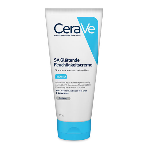 Entdecken Sie die SA Urea Glättende Feuchtigkeitscreme mit 10 % Urea von CeraVe für eine glatte, geschmeidige, mit Feuchtigkeit versorgte, Haut. Mithilfe von Salicylsäure peelt die Creme Ihre Haut und bereitet sie optimal auf die Aufnahme weitere Inhaltsstoffe vor. Durch die abschilfernde Wirkung verbessert die Pflege zudem die Hautstruktur und sorgt für einen ebenmäßige Haut. Hochkonzentriertes Urea schenkt Ihnen langanhaltende Feuchtigkeit, indem der Inhaltsstoff tief in die Haut abgegeben wird und dort Wasser speichert. 3 essentielle Ceramide stellen die Hautschutzbarriere wieder her, während Hyaluronsäure zusätzlich Feuchtigkeit spendet. Dank der patentierten MVE-Technologie von CeraVe werden die Wirkstoffe der Feuchtigkeitscreme über einen längeren Zeitraum kontrolliert freigesetzt. Dadurch wird die Haut auch nach dem Auftragen bis zu 24 Stunden gepflegt. Die nicht fettende SA Urea Glättende Feuchtigkeitscreme mit 10 % Urea von CeraVe ist besonders für trockene bis sehr trockene, raue und unebene Haut geeignet. Ideal auch gegen Reibeisenhaut. Die Wirksamkeit der Pflege wurde bei Reibeisenhaut nachgewiesen.