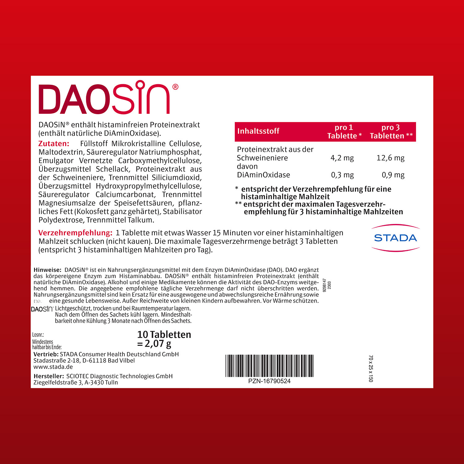 Verzehrempfehlung: Nehmen sie 15 Minuten vor einer histaminhaltigen Mahlzeit 1 Tablette ein.
