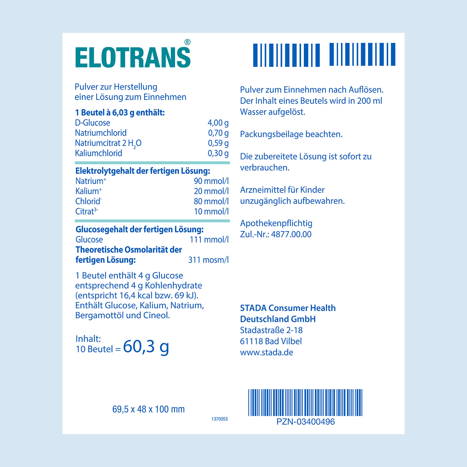 Anwendungshinweise: Lösen Sie den Inhalt eines Beutels Elotrans® in 200 ml Flüssigkeit auf. Falls kein Trinkwasser vorhanden ist, kann auch abgekochtes, abgekühltes Wasser verwendet werden. Die Flüssigkeitsmenge, in der 1 Beutel Elotrans® aufgelöst werden soll, ist genau einzuhalten, da sonst nicht die optimale Zusammensetzung an Salzen, Zucker und Flüssigkeit erreicht ist und Störungen des Salzhaushaltes im Körper verursacht werden könnten. Verwenden Sie die fertig gestellte Lösung sofort. Heben Sie eventuelle Reste der Lösung nicht auf. Elotrans® Lösung nicht kochen!