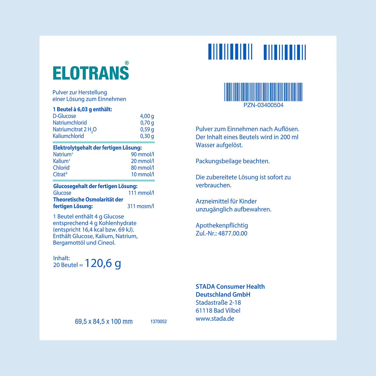 Anwendungshinweise: Lösen Sie den Inhalt eines Beutels Elotrans® in 200 ml Flüssigkeit auf. Falls kein Trinkwasser vorhanden ist, kann auch abgekochtes, abgekühltes Wasser verwendet werden. Die Flüssigkeitsmenge, in der 1 Beutel Elotrans® aufgelöst werden soll, ist genau einzuhalten, da sonst nicht die optimale Zusammensetzung an Salzen, Zucker und Flüssigkeit erreicht ist und Störungen des Salzhaushaltes im Körper verursacht werden könnten. Verwenden Sie die fertig gestellte Lösung sofort. Heben Sie eventuelle Reste der Lösung nicht auf. Elotrans® Lösung nicht kochen!