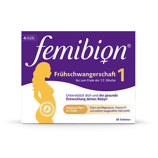 Femibion® 1 Frühschwangerschaft steht Ihnen in den ersten drei Monaten Ihrer Schwangerschaft mit seiner speziell abgestimmten Rezeptur zur Seite. Es enthält Folsäure und Metafolin®***. Metafolin® ist eine Folatform, die dem Körper direkt zur Verfügung steht, ohne umgewandelt werden zu müssen. Und es enthält weitere wertvolle Nährstoffe.