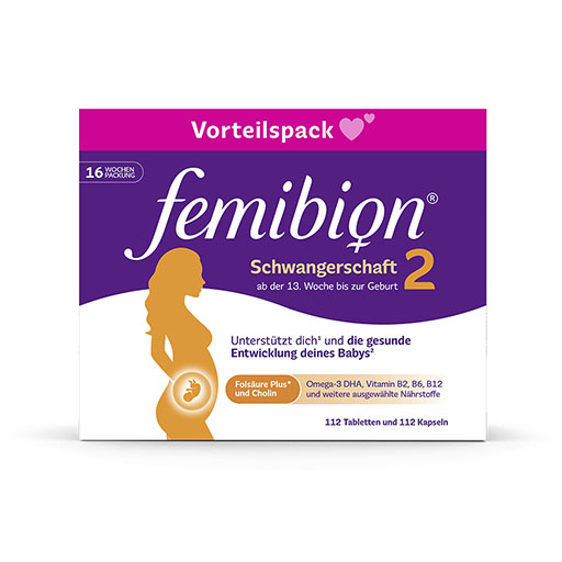 Femibion® 2 Schwangerschaft ist speziell auf den besonderen Bedarf von Ihnen und Ihrem Baby in dieser Phase abgestimmt.* Neben Folat (Folsäure und Metafolin®) enthält Femibion® 2 Schwangerschaft Eisen und DHA. Eisen trägt zur normalen Bildung von roten Blutkörperchen und Hämoglobin sowie zur Verringerung von Müdigkeit und Ermüdung bei.