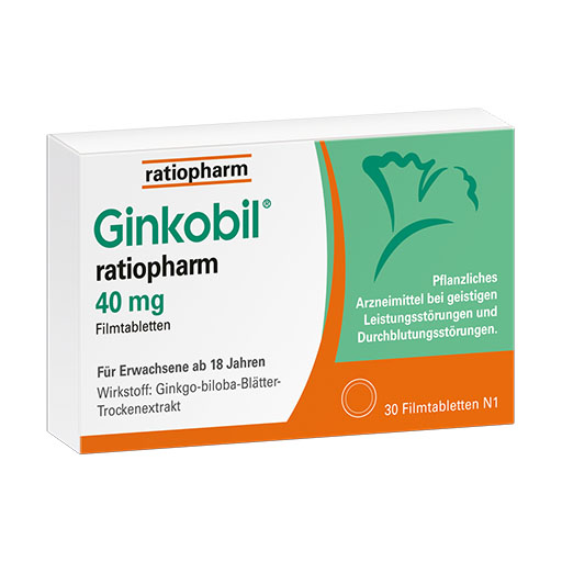 Wirkstoff: Ginkgo-biloba-Blätter-Trockenextrakt. Anwendungsgebiete: -40 mg; 80 mg; 120 mg; Tropfen: Zur symptomatischen Behandlung von hirnorganisch bedingten Leistungsstör. im Rahmen eines therapeutischen Gesamtkonzeptes bei Abnahme bzw. Verlust erworbener geistiger Fähigkeiten (dementielles Syndrom) mit den Hauptbeschwerden: Gedächtnisstörungen, Konzentrationsstörungen, depressive Verstimmung, Schwindel, Ohrensausen, Kopfschmerzen. Verlängerung der schmerzfreien Gehstrecke bei peripherer arterieller Verschlusskrankheit bei Stadium II nach FONTAINE („Schaufensterkrankheit“) im Rahmen physikalisch-therapeutischen Maßnahmen, insbesondere Gehtraining. Schwindel, Ohrgeräusche infolge Durchblutungsstörungen oder altersbedingten Rückbildungsvorgängen. -240 mg: Zur Verbesserung einer altersbedingten kognitiven Beeinträchtigung (Verschlechterung geistiger Fähigkeiten) und der Lebensqualität bei leichter Demenz. Warnhinw.: -Filmtbl.: AM enth. Lactose u. weniger als 1 mmol Natrium (23 mg) pro Filmtbl., d.h. es ist nahezu „natriumfrei“. -Tropfen: AM enth. weniger als 1 mmol (23 mg) Natrium pro 40 Tr., d.h., es ist nahezu „natriumfrei“.