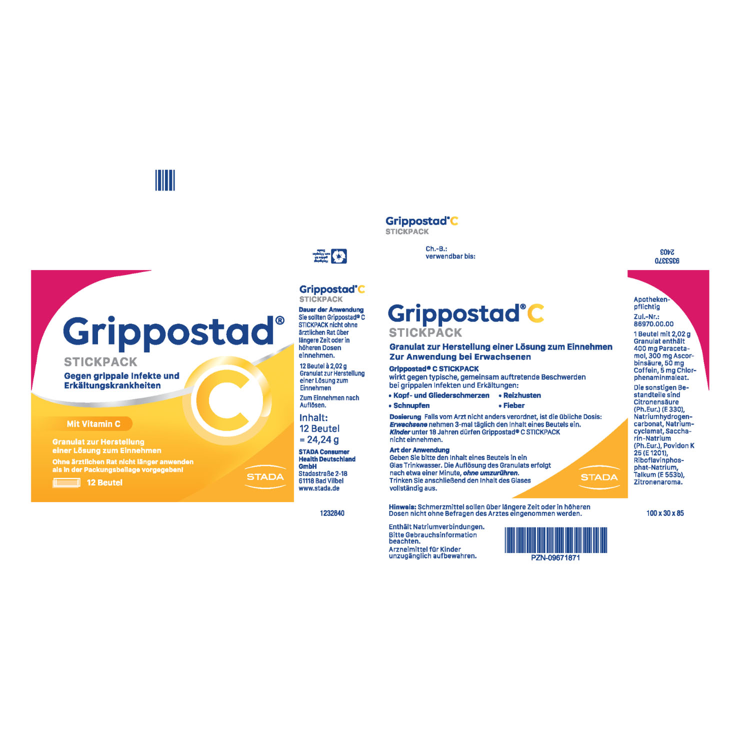 Grippostad® C Trinkgranulat enthält eine Kombination aus Para- cetamol, Chlorphenaminmaleat, Vitamin C und Coffein. Die Stick- packs enthalten eine Kombination aus Paracetamol, Chlorphenaminmaleat, Vitamin C und Coffein. Sie wirken gegen Reizhusten, Erkältungsfieber, Kopf- und Gliederschmerzen und Schnupfen in einem und lindern schnell diese gemeinsam auftretenden Erkältungssymptome.
