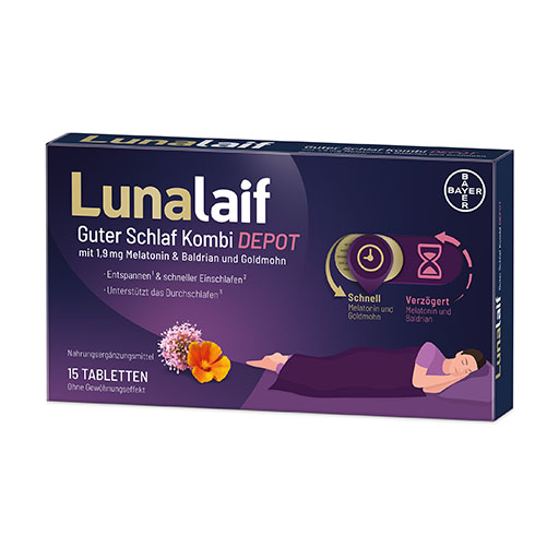 Damit nicht nur die Einschlafzeit verkürzt1, sondern auch Durchschlafprobleme verringert³ werden, arbeitet Lunalaif® Guter Schlaf Kombi Depot mit der Depot-Technologie. Diese sorgt dafür, dass im Laufe der Nacht weitere 0,9 mg Melatonin zusammen mit 210 mg Baldrianextrakt freigesetzt werden. Baldrian ist schon lange für seine beruhigenden Eigenschaften bekannt. Es trägt zur Aufrechterhaltung des Schlafs³ bei und unterstützt somit eine erholsame Nachtruhe. Lunalaif® Guter Schlaf Kombi Depot ist gut bekömmlich und verursacht weder einen Gewöhnungseffekt noch Tagesmüdigkeit. Die empfohlene Verzehrmenge liegt bei einer Tablette pro Tag, die 30 bis 60 Minuten vor dem Zubettgehen eingenommen werden sollte.