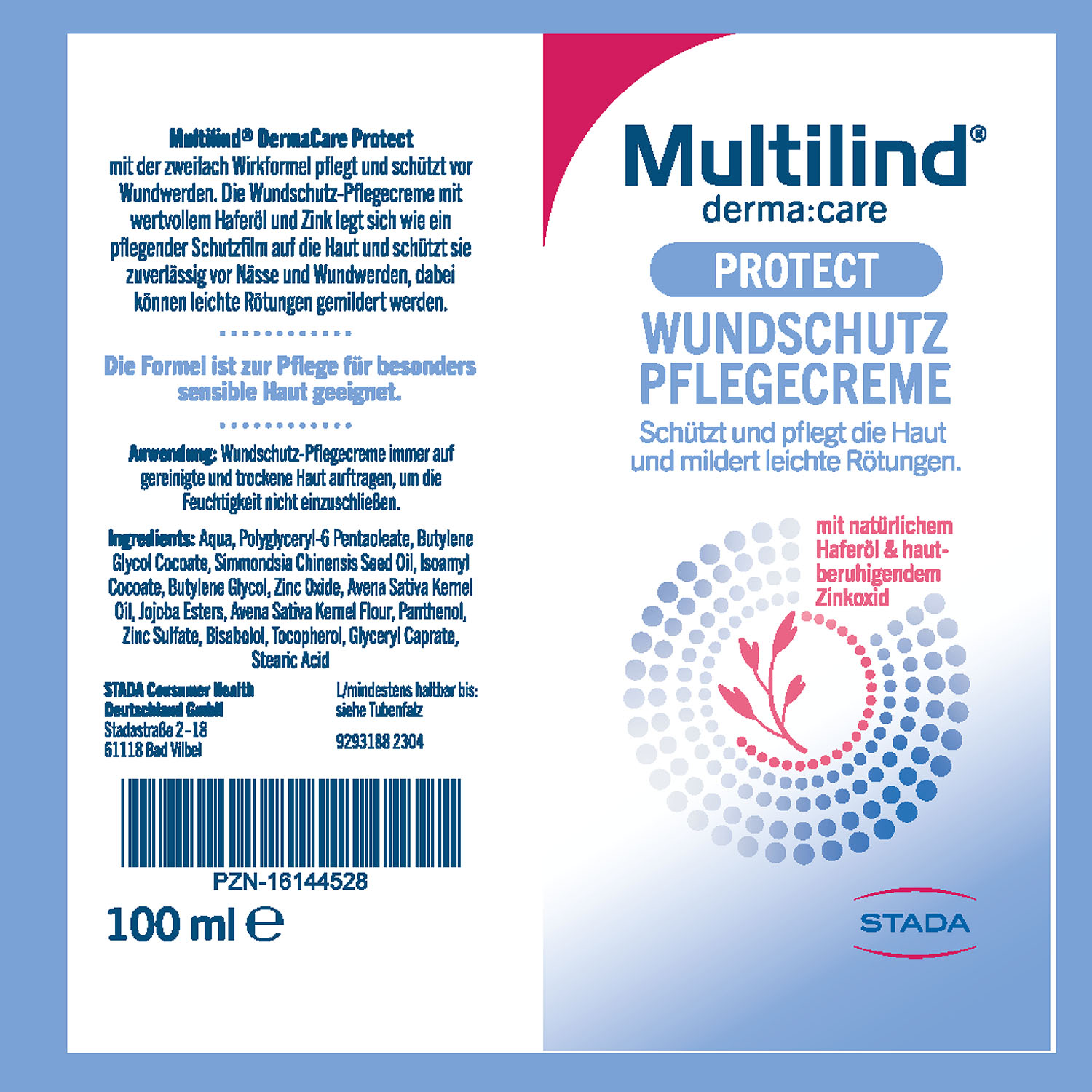 Die Wundschutz-Pflegecreme Multilind® DermaCare Protect mit der 2-fach Wirkformel legt sich wie ein pflegender Film auf die gestresste Haut und schützt im Windelbereich zuverlässig vor Nässe und Wundwerden und mildert leichte Rötungen. Natürliches Haferöl wirkt feuchtigkeitsspendend, antioxidativ und unterstützt die Hautregeneration. Zinkoxid mildert Reizungen und regeneriert nachhaltig die Hautschutzbarriere. Die Formel zur Pflege ist für besonders sensible Haut geeignet.