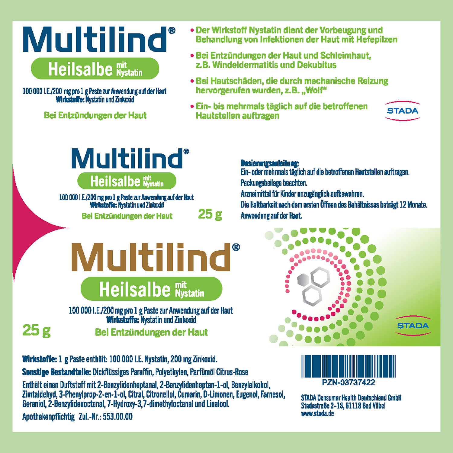 Ob bei Windeldermatitis, für Sportler die sich einen Wolf gelaufen haben oder bei roten, juckenden Stellen oder Hautschädigungen durch Druckbelastung, beim Stillen oder durch mechanische Reibung: Die bewährte Multilind Heilsalbe hilft wunder Haut mit einer hochwirksamen Kombination aus Zinkoxid und Nystatin. Ist die Haut an einigen Stellen beschädigt, haben Bakterien und Pilze leichtes Spiel- Sie können in kleine Wunden eindringen und die Entzündung durch eine Hefepilzinfektion verschlimmern. Oft entsteht dann ein nässender und juckender Ausschlag. Multilind lindert den Juckreiz, hemmt die Entzündung, fördert die Heilung und lässt sich dank der Spezial-Salbengrundlage mit Softformel sanft und schmerzlos auftragen.