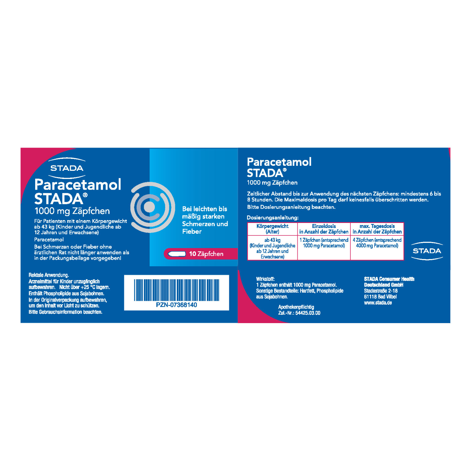 Hinweis: Bei Schmerzen oder Fieber ohne ärztlichen Rat nicht länger anwenden als in der Packungsbeilage vorgegeben! Zeitlicher Abstand bis zur Anwendung des nächsten Zäpfchens: mindestens 6 bis 8 Stunden. Die Maximaldosis pro Tag darf keinesfalls überschritten werden. Bitte Dosierungsanleitung beachten. Für Patienten mit einem Körpergewicht ab 43 kg (Kinder und Jugendliche ab 12 Jahren und Erwachsene). Enthalten Phospholipide aus Sojabohnen.